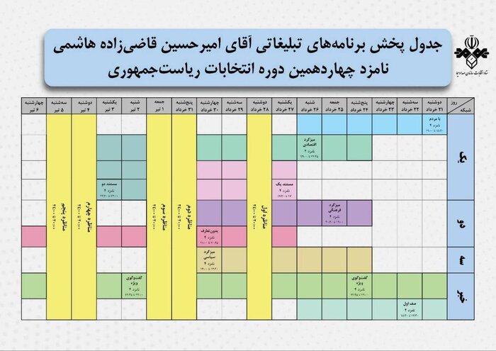 برنامههای تبلیغاتی نامزدها از فردا دوشنبه ۲۱ خرداد آغاز میشود و در اولین روز ویژه برنامه امیرحسین قاضیزاده از شبکه یک و ویژه برنامههای محمدباقر قالیباف و مسعود پزشکیان از شبکه خبر پخش میشود.