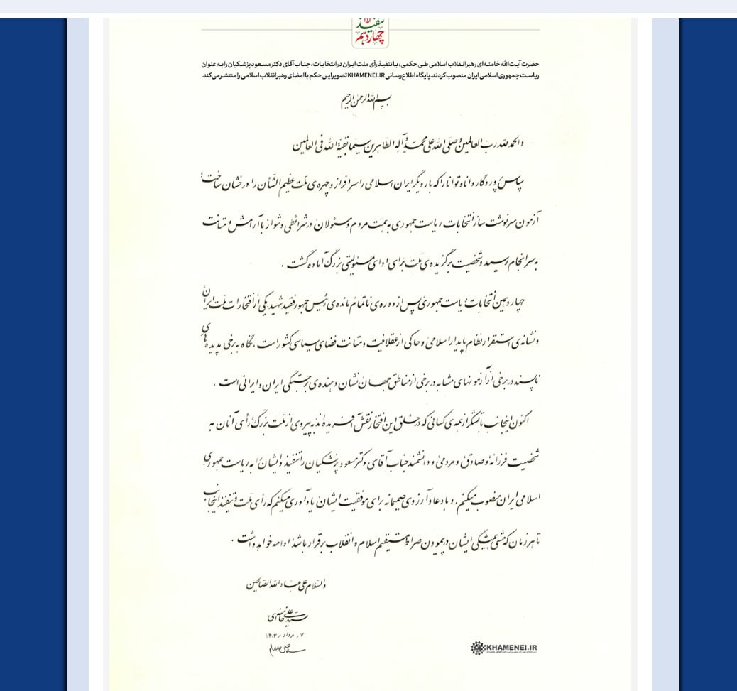 اکنون اینجانب با تشکر از همه‌ی کسانی که در خلق این افتخار نقش آفریده‌اند، به پیروی از ملت بزرگ، رأی آنان به شخصیت فرزانه، و صادق،‌ و مردمی، و دانشمند جناب آقای دکتر مسعود پزشکیان را تنفیذ و ایشان را به ریاست جمهوری اسلامی ایران منصوب میکنم. و با دعا و آرزوی صمیمانه برای موفقیت ایشان، یادآوری میکنم که رأی ملت و تنفیذ اینجانب تا هر زمان که مشی همیشگی ایشان در پیمودن صراط مستقیم اسلام و انقلاب برقرار باشد، ادامه خواهد داشت. والسلام علی عبادالله الصالحین  سید علی خامنه‌ای  ۷/مرداد/۱۴۰۳