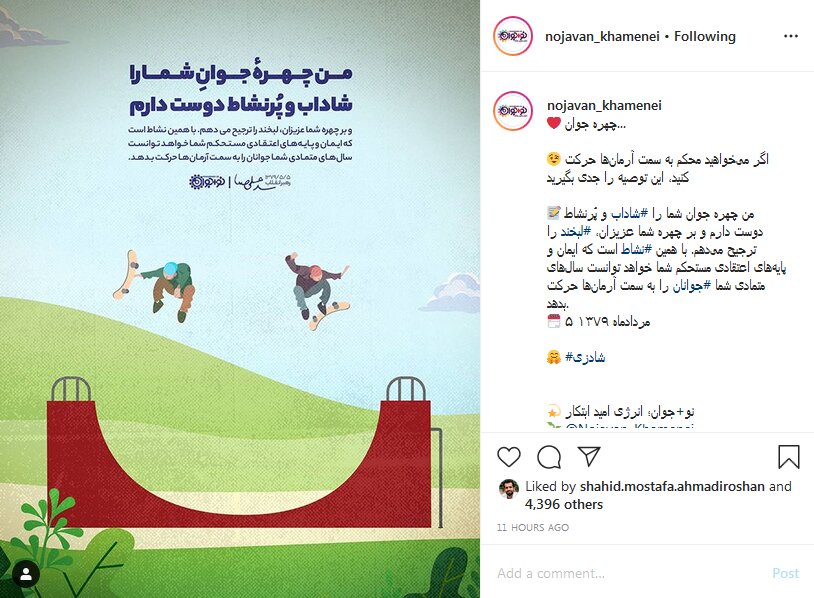 صفحه اینستاگرامی نوجوان، منتسب به دفتر حفظ و نشر آثار مقام معظم رهبری، پیش از این اعلام کرده بود توصیههایی برای شاد زیستن منتشر خواهد کرد و یکی از این توصیهها را که سخنانی از رهبر معظم انقلاب است به تازگی بازنشر کرده و نوشت: