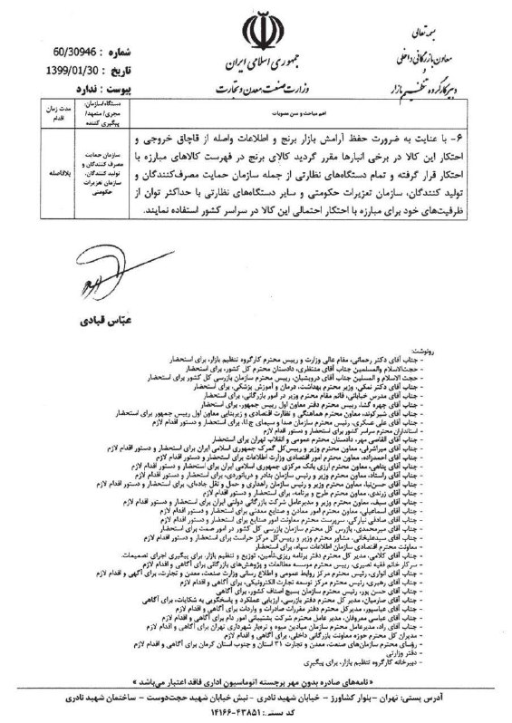 با عنایت به ضرورت حفظ آرامش بازار برنج و اطلاعات واصله از قاچاق خروجی و احتکار این کالا در برخی انبارها مقرر گردید، کالای برنج در فهرست کالاهای مبارزه با احتکار قرار گرفته و تمام دستگاههای نظارتی از جمله سازمان حمایت مصرف کنندگان و تولید کنندگان، سازمان تعزیرات حکومتی و سایر دستگاههای نظارتی با حداکثر توان از ظرفیتهای خود برای مبارزه با احتکار احتمالی این کالا در سراسر کشور استفاده نمایند.