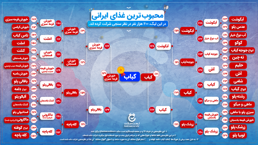 در نهایت در روز فینال، کباب توانست با 61 درصد آرا در مقابل 39 درصد آرای قرمه سبزی، عنوان محبوب ترین غذای ایرانی از دیدگاه مردم را کسب کند. لستسکند از همهی دوستانی که در این نظرسنجی شرکت کردند و در طول اجرای آن همراه ما بودند، نهایت تشکر و قدردانی را دارد. هر کدام از این غذاها و خوراکها، طعم و مزه خاصی را در هر نقطه از این کشور دارند و گذشته از آن، غذاهای بومی مناطق مختلف نیز واقعا شایسته شناخته شدن بیشتر هستند. امید آن را داریم تا بتوانیم با کمک شما، در آینده، قدمی هر چند کوتاه در شناخته شدن هر چه بهتر غذاهای ایرانی در سطح بین المللی داشته باشیم.